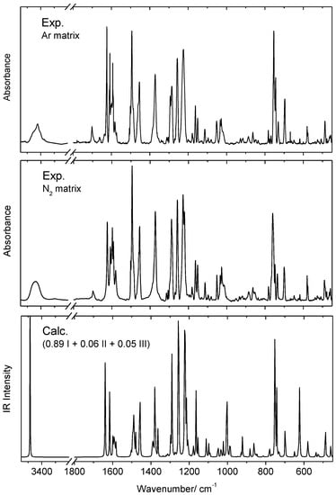Unfortunately, the assignment of individual bands to specific conformers could not be done, even taking into account the results of the UV irradiation experiments. As mentioned in Section 3.2, the spectra of the three conformers are very similar, in particular, those of conformers II and III. Hence, since irradiation led to the consumption of conformer II and the formation of conformer III (and I, which also has most of its bands coincident with those of conformers II and III: see Table S2), the appearance of negative bands in the difference spectra, shown in Figure 4, does not mean that these bands are only ascribable to conformer II; in the same way, the fact that the bands appear as positive in the difference spectra does not imply that this conformer does not also contribute to their intensity. Nevertheless, the presence of the three conformers in the matrices is beyond doubt, as is the fact that the UV irradiation of the matrices leads to their interconversion.