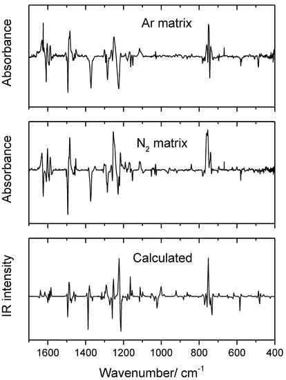 Detailed comparison of the experimental results with the calculated spectra of conformers I, II and III allowed us to conclude that the amount of conformer II present in the matrices after irradiation diminished, while the amount of conformers I and III increased. A simulated IR difference spectrum defined as a1 × SIR(I) + a3 × SIR(III)−SIR(II), where SIR(x) represents the calculated spectrum of conformer x, and the coefficients ax apply to the intensities (a1 + a3 = 1), was then obtained by adjusting the coefficients a1 and a3 to reproduce, as best as possible, the experimental difference spectra. A good solution was obtained for a1 = 0.43 and a3 = 0.57 (see Figure 4), which indicated that, upon irradiation, the population of conformer III increased somewhat more than that of conformer I.
