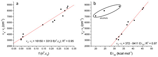 From the slope of the Lippert-Mataga plot (16,150 cm−1), it is possible to determine that Δµ for compound 3 is ca. 16.28 D, which is considerably large and confirms that a photoinduced charge transfer occurs upon excitation. It is also worth noting that the Stokes shift (Δυ) of 3 is highly correlated with the Lippert-Mataga parameter, with an R2 for the linear fit of 0.95. Similar linearity is observed when Δυ is plotted against the empirical polarity descriptor ET(30) if protic solvents are not considered (Figure 2b) [30].
