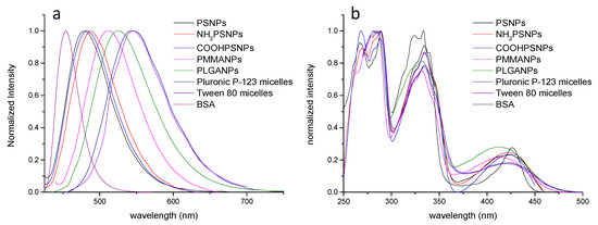 In summary, this study demonstrates that NI 3 exhibits (i) photoinduced CT with concomitant dipole moment change upon excitation, (ii) large Stokes shift that increases with solvent polarity/dielectric constant, and (iii) linear and predictable variation of photophysical parameters as a function of polarity descriptors. Therefore, 3 shows considerable potential as a fluorescent polarity probe. Under this framework, we pursued the probing of local polarity in relevant nanocarriers. This parameter is of crucial importance not only for engineered drug delivery systems but also for the development of photonic nanomaterials, since the photophysical performance of luminophores is usually intrinsically associated with carrier polarity, especially when excited state energy levels are important. As relevant nanocarriers, we selected polystyrene (PS, pristine, amino- and carboxyl-functionalized), poly(mehtylmethacrylate) (PMMA) and poly(lactic-co-glycolic acid) (PLGA) nanoparticles (NPs), bovine serum albumin (BSA), and biocompatible surfactant micelles of Tween® 80 and Pluronic® P-123. The carriers were loaded with 3 and the optical properties of the resulting materials were characterized. The size distribution of the isolated nanoparticles is summarized in Figure A3. Dye concentration in the carrier was kept at or below 1% (w/w) to prevent aggregation and emission reabsorption. The obtained results are summarized in Figure 4 and Table 2.