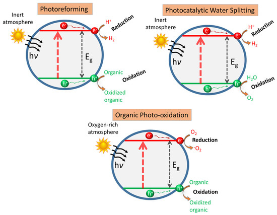 Mechanism involved in photoreforming, photocatalytic water splitting and organic photo-oxidation [15].