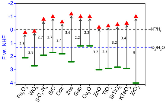 Along with this, some technical challenges are designing the appropriate semiconductors with effective charge carrier separation, a high rate of diffusion of the produced charge carriers and their movement towards the active centers of the surface, the appropriate arrangement of edge potentials in the CB and VB for the desired reactions, exposed reaction sites and easy preparation of catalytic materials without using infrequent materials [28]. This results in the enhancement of the efficiency of the catalyst, mainly depending on engineering materials, which should lead towards improving the significant parameters. The band gap, band positions and redox potentials of various types of photocatalytic materials are described in Figure 2.