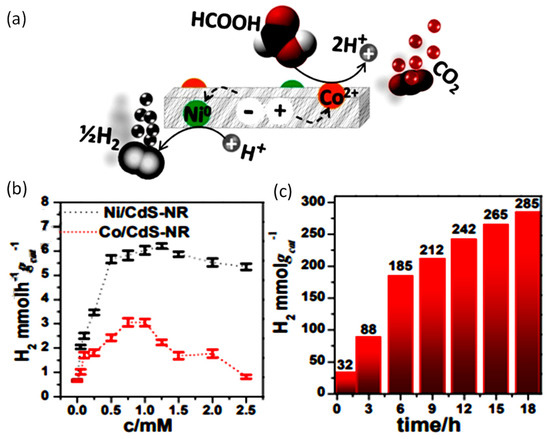 Jamal et al. selectively produced hydrogen photo-catalytically from FA efficiently using non-noble metals, such as cobalt and nickel, as redox mediators on CdS nanorods, as shown in the following. The effect of co-catalysts was also studied on the decomposition of FA. Here, the high hydrogen production of 32.6 mmol h−1g−1 from FA was obtained by sustaining the production rate for 12 h [79]. The mechanism involved a substantial increase in FA-to-H2 activity for Ni/CdS-NR, the quenching of the PL signal and the reduction of Ni+2 to Ni0 in the reaction system by photogenerated electrons at the CB of CdS. This band offset between CdS and Ni0 provides a conduit for electrons to pass from CdS to Ni0. The Co is not deposited on the CdS, but it is present in the reaction media. The observed enhanced activity presumably occurs through transitory contact with the CdS, forming a bound Co-hole formate species. Therefore, the improved catalysis is due to the cooperative redox mediation of Ni0 and Co3+, where both the reductive and oxidative half-reactions are enhanced, as shown in Figure 4. Further various co-catalysts are developed to increase hydrogen production with great sustainability, which are discussed in Table 1.