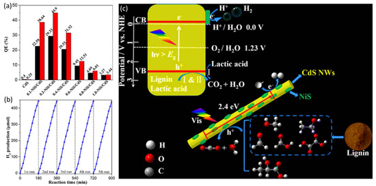 (a) Comparison of the quantum efficiency of hydrogen production on NiS/CdS using lignin and LA as a sacrificial agent; (b) Long-term stability of the production of H2 on a NiS/CdS photocatalyst; (c) Mechanism involved in the lignin and LA reformation of NiS/CdS photocatalysts. Reprinted with permission from Elsevier Ref. [124], 2018, Chunhe Li et al.