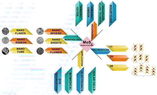 This article briefly discusses the structure, geometry, methods of preparation, characterization, and application of MoS2-based nanomaterials. The research achievements made in improving the degradation performance of MoS2-based photocatalysts have been explored. The schematic illustration of the MoS2-based catalysts’ preparation, morphology, and applications are given in Figure 1.