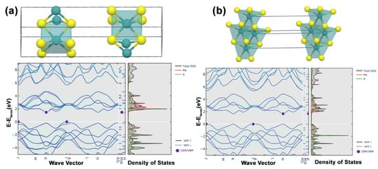 The geometrical representation of Hexagonal MoS2 with their band structure and density of states of space group (a) P63/mmc, (b) P6m2. Reprinted with Creative Commons Attribution 4.0 License (CC BY 4.0) [46]. This work is licensed under copyleft, a CC BY 4.0 open source license.