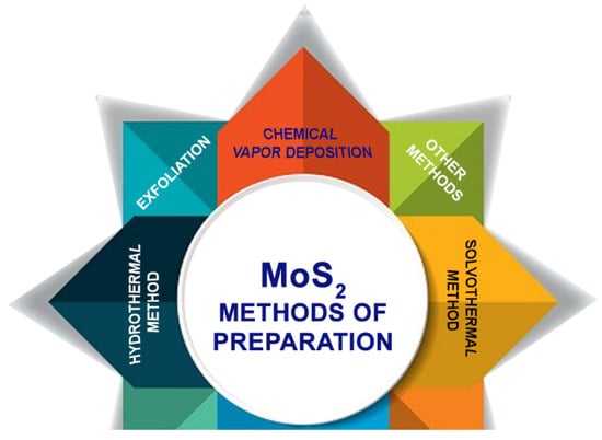 For the preparation of MoS2, a variety of physical and chemical approaches have been used. The generally used physical methods are (a) mechanical exfoliation, (b) sputtering, (c) epitaxy, (d) plasma, etc. The lattice structure of the material will not change or be destroyed in this method, provided the precursor materials are pure [38]. However, in recent studies, physical methods are not commonly used since they are not cost effective. The chemical methods include (a) chemical vapor deposition method, (b) hydrothermal method, and (c) solvothermal method. The most common methods of preparation are listed in Figure 6.
