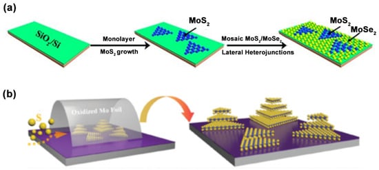 (a) Representation diagram of the synthesis of MoS2 by chemical vapor deposition method [57] (b) Representation for the CVD growth of MoS2 using arched oxidized Mo foil as the precursor [58]. Reprinted with permission from ref. [57,58]. Copyright 2018-MDPI, Copyright 2020-Elsevier.