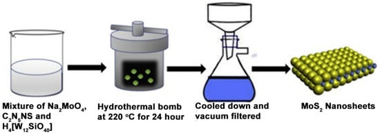 Hydrothermal method: The hydrothermal method is a promising wet chemical method that is performed using a hydrothermal bomb. The temperature used for this method is usually 180 °C [59]. Typically, the precursors used are sodium molybdate (Na2MoO4·2H2O) and ammonium molybdate tetrahydrate ((NH4)6Mo7O24⋅4H2O) for molybdenum and thiourea (CS(NH2)2) for sulfur. Nanosheets [60], nanospheres [61], nanoflowers [62], and nanotubes [63] can be prepared using hydrothermal methods. It is the most frequently used method for synthesis of flower-like MoS2 [64]. Figure 8 represents the preparation steps of MoS2 nanosheets. The molybdenum source was Na2MoO4·2H2O, and the sulfur source was thiourea in the synthesis proposed by Zou et al. [65]. The MoS2-RGO-3 was generated using a hydrothermal process and had a structure that resembles a cabbage, with distinct lattice fringes and a diameter range of 500 nm−1. 3D MoS2 ultrastructure was prepared by Anwer et al. [66], who used a controllable hydrothermal approach to achieve their results. These micro-sized marigold flower-like patterns were made up of 2D ultrathin MoS2 nanosheets that were randomly spaced but closely connected. Controlling the input concentrations of thiourea and the precursor of MoS2 resulted in the MoS2-microflower composition. Tong et al. [67] have used a previously published hydrothermal method for MoS2 preparation. The flower-like MoS2 had a hierarchical structure with a diameter of 500 nm and was subjected to an 18 h hydrothermal reaction at 220 °C. The MoS2 nanoflowers made by the hydrothermal process were composed of uniform crystallinity and size with minimum agglomeration. Zhou et al. [68] have replaced the sulfur source with thioacetamide in their studies. Xia et al., in their recent study, synthesized the CdS@MoS2 nanocomposite using the hydrothermal method, and evaluated the photocatalytic degradation of Rhodamine 6G (Rh 6G), and found that adsorption in the nanocomposite increases when the MoS2 amount is increased, showing a great efficacy in processing Rh 6G [69]. Jian et al. used a two-step hydrothermal method to prepare the nanocomposite MoS2/BiOBr, which is very efficient in Rhodamine B (RhB) dye degradation [70].