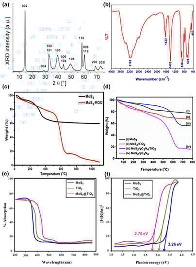 (a) XRD plot of MoS2, (b) FTIR plot of MoS2, (c,d) TGA curves of MoS2, (e) UV-DRS graph of MoS2, (f) Tauc plot of MoS2. Reprinted with permission from ref. [59,81,86,87,88]. Copyright 2011-Springer, Copyright 2019-Springer. Copyright 2020-Springer, Copyright 2017-American Chemical Society. Copyright 2020-Springer.