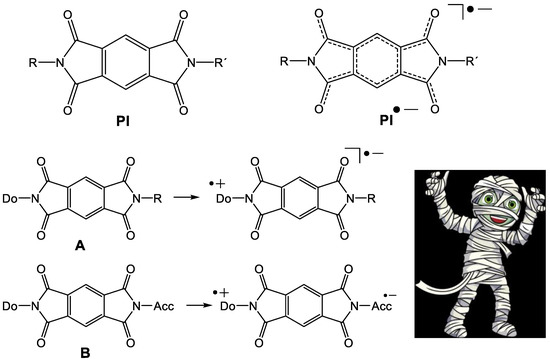 The pyromellitic acid diimide (PI) and the PI anion radical (PI•‒). A: PI with donor in a dyad. B: PI with donor and acceptor acts as a molecular wire and chemically stable molecular mummy.