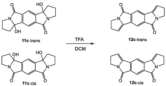 160 mg (0.5 mmol) of the product mixture of 11c-trans and 11c-cis was suspended in 25 mL of CH2Cl2 and a few drops of TFA were added while stirring, until a clear solution resulted. After stirring for 10 min, the solution was washed with 5% bicarbonate solution and brine. After drying over MgSO4, the solvent was removed and column chromatography (silica gel, CH2Cl2/MeOH 100:1) yielded two products as yellow solids. One of them could be identified as 12c-cis. The other product could not be analyzed by NMR due to solubility issues. Its HR-MS spectrum confirmed the expected mass for 12c-trans.