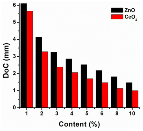 Depth of cure (DoC) of the samples synthesized using different wt% of metal oxides and PEGDA in the presence of 0.2 wt% BDMB under air upon exposure to LED@405 nm.