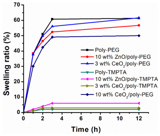 It is obvious from Figure 3 that after 12 h of exposure to water, both the Poly-PEG and metal oxide/Poly-PEG showed a high swelling rate, which reflected their excellent water absorption properties. It also represented a larger specific surface area of the photocatalyst in contact with the solution, which was beneficial for the adequate reaction of the photocatalyst with the dye. At the same time, the addition of fillers demonstrated the limited effect on the water absorption properties of the composites. It also indicated that ZnO and CeO2 were very well integrated in the internal structure of the polymers.