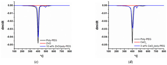 Decomposition temperatures of (a) Poly-PEG, ZnO powder, and 10 wt% ZnO/Poly-PEG composite; (b) Poly-PEG, CeO2 powder, and 3 wt% CeO2/Poly-PEG composite. TGA curves of (c) Poly-PEG, ZnO powder, and 10 wt% ZnO/Poly-PEG composite; (d) Poly-PEG, CeO2 powder, and 3 wt% CeO2/Poly-PEG composite.