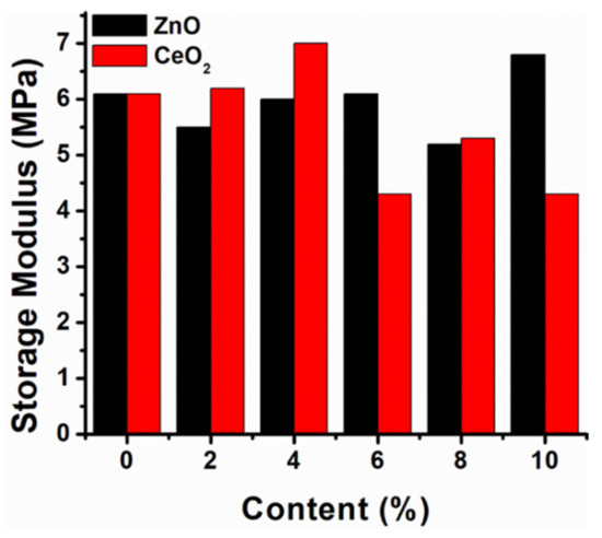 Mechanical properties of the synthesized composites were investigated using dynamic mechanical analysis (DMA). The obtained values of dynamic storage modulus G′ at room temperature (25 °C) are presented in Figure 7.