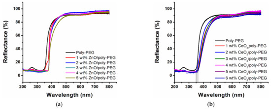 The light reflection peaks of the composites generated a red-shift in the emission range of the 405 nm LED with the increase in the metal oxide particle content, which was especially obvious for CeO2/Poly-PEG. This indicated an increase in the range of light absorption by the composites. The results of apparent absorbance limits are listed in Table S1. The light absorption wavelength interval of the composites matched with the optical properties of ZnO and CeO2 particles reported in the relevant literature [28,42]. Taking into account that the XRD data do not change after the formation of the composites, the polymer, which was used as a substrate, also does not affect the light absorption properties of the metal oxide, but served as protection. The accurate and intense absorption of light in the UV wavelength range was an advantage for the photocatalytic performance of these new composites.
