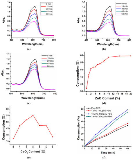 Figure 9a–c show the effectiveness of metal oxide/polymer composites for the Acid Black photodegradation. Without irradiation (in dark conditions), there is no significant degradation of the dye (<5%). This clearly shows that a photochemical process is associated with the degradation. The absorption maxima at 618 nm steadily diminished during the irradiation, showing the breakdown of the azo N=N bond and the naphthalene groups. For ZnO/Poly-PEG (Figure 9d), the photodegradation of Acid Black by the new photocatalyst was positively correlated with the increase in ZnO content. The increase in photocatalytic capability reached a plateau at around 59% for 10 wt% of ZnO (Figure 9d). Thereafter, the effect of enhancing the photocatalyst performance by means of increasing the ZnO content was not obvious. Interestingly, the results of CeO2/Poly-PEG had a different performance (Figure 9e). Specifically, the increase in CeO2 also improved the catalytic performance significantly at the mixed content of 0–3%. The catalyst with a CeO2 content of 3% demonstrated the best catalytic performance (Acid Black degeneration ~56%). However, when the content was higher than 3%, the continued addition of CeO2 caused a marked decrease in the catalytic performance. At a CeO2 content of 6%, the performance was even almost equal to that of the polymer matrix without CeO2. It may be attributed to the fact that the increased amount of CeO2 may not be better wetted by the PEGDA. Accordingly, ZnO and CeO2 in the new composite are required to have an optimum content (10 wt% and 3 wt%, respectively) to achieve the best catalytic performance.