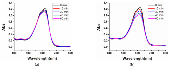 The photodegradation of Acid Black took place under the irradiation of UV lamps in water solution, whose concentration was 15 ppm (24.25 µmol·L−1, pH = 5.9). First, 4 mL of the above solution was added to the cuvette together with the prepared metal oxide/polymer composite photocatalyst. After every 15 min of irradiation, the cuvette was placed in a JASCO V730 spectrophotometer for UV–Vis absorption spectroscopy and the change in the absorption peak at 618 nm (maximum absorption wavelength of Acid Black solution) was observed.