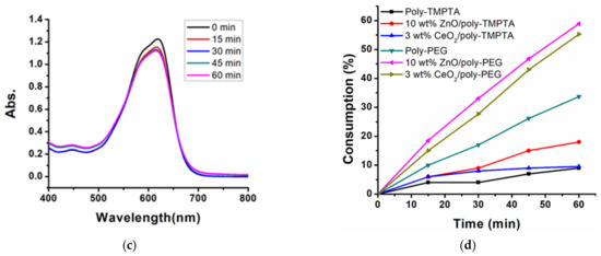 As a common metal oxide photocatalyst, the photocatalytic performance of TiO2 has been widely known. It has been reported that Acid Black 1 can be degraded by TPAPP/TiO2 under sunlight [43]. As a result, the photocatalytic ability of the new metal oxide/polymer composite was compared with that of TiO2. The photodegradation properties of 1 wt% TiO2/Poly-PEG was only about 5% higher than Poly-PEG under the same conditions, but much lower than the samples developed in this research (Figure 9f).