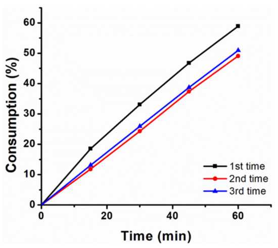 The stability of the photocatalyst is extremely important for practical applications because it meets the requirements of economy, practicality, and environmental protection. So, photocatalytic experiments were repeated three times with the same composite, which was recovered from the dye solution after a depollution cycle, washed several times with water, dried in the open air, and then used again for the next catalytic cycle. As shown in Figure 11, the stability of new photocatalyst was assessed using the cycle tests of 10 wt% ZnO/Poly-PEG composites for Acid Black photodegradation. After the first cycle of dye degradation, the degradation efficiencies began to decline but remained constant for the 2nd cycle and 3rd cycle, demonstrating their high photocatalytic stability by using a simple and low-cost regeneration process.