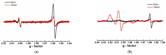 ESR spectra obtained at room temperature (20 °C) from ESR experiments under irradiation with an LED emitting at 405 nm under air. (a) ZnO/Poly-PEG, irradiation time = 15 min (red) and = 0 min (black) spectra, respectively; (b) ZnO/Poly-PEG, using PBN = 2 mg/mL (as the spin trap agent), irradiation time = 15 min (red) and = 0 min (black) spectra.
