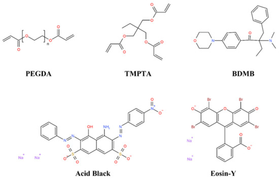 Poly ethylene glycol (600) diacrylate (PEGDA) and trimethylolpropane triacrylate (TMPTA) were selected as monomers for composite synthesis and were purchased from Allnex. 2-Benzyl-2-dimethylamino-1-(4-morpholinophenyl)-butanone-1 (Speedcure BDMB) was obtained from Lambson Ltd. (Wetherby, UK) and used as the photoinitiator. Acid Black and Eosin-Y were purchased from Sigma-Aldrich. Chemical structures of the reagents used in this study are shown in Scheme 1. The metal oxides used were zinc oxide (ZnO), 99.99% (metals basis) from Thermo Fisher Scientific (87812) and cerium(IV) oxide (CeO2) was obtained from Solvay. Titanium(IV) oxide (TiO2), anatase, 99.8% (metals basis) was from Sigma-Aldrich (232033).