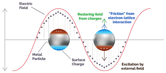 Schematic trends of a plasmonic nanoparticle under excitation. The (brown) color represents the incoming electromagnetic field and changes induced in it are followed by the motion of the carriers; thus, surface charges (blue) produce a restoring force towards the outer side of the equilibrium, and electron vibrational motions (blue) result in hindering caused by the ionic system. Reprinted with permission from Reference [20]. Copyright (2019) American Chemical Society.