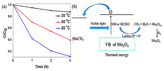Photo-thermal synergic interaction mode is also applied to degrade certain dyes, in which thermocatalysis shows no activity, but the photocatalytic activity of the catalytic system is increased with the increase in reaction temperature. Wang et al. degraded the methylene blue (MB) via thermal-assisted photocatalysis by constructing the Mn3O4/MnCO3 system [100]. The system showed negligible degradation under the dark or irradiation at 20 °C, while under visible-light exposure, the degradation rate was increased with increasing of temperature (Figure 8a). Consequently, the enhanced catalytic performance of the Mn3O4/MnCO3 nanocomposite under photo-thermal effects was not only because of the photocatalysis and thermocatalysis, but also due the existence of synergistic influence which existed in Mn3O4/MnCO3 nanocomposites, infatuating significant oxygen present in the lattice to entrap the holes, which then led to efficient oxidization at high temperatures (Figure 8b). Huang et al. synthesized the nanocomposite system of cerium oxide–cerium nitride (CeO2/CeN) to degrade MB in wastewater using the photo-thermal catalytic method. No degradation efficiency was obtained after heating the solution to 80 °C under dark, while the photocatalyst showed a 90% degradation rate in 1 h below 25 °C, and obtained a 100% degradation rate in 30 min without the temperature regulation, signifying that the thermal effect generated by light irradiation enhanced the photodegradation efficiency [101].