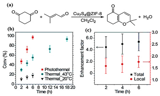 In another example, Wang et al. performed a cyclic condensation reaction by applying Cu7S4@ZIF-8 nanocomposites (Figure 9a) [103]. Figure 9b shows that the conversion rate of the photo-thermal catalytic process reached 97.2% within 6 h of irradiation, while at temperatures of 43 °C and 20 °C, pure thermocatalysis rates were only up to 55.4% and 18.1%, correspondingly. The conversion rate of 93.5% was finally reached at 43 °C by extending the reaction duration to 18 h, indicating that the traditional heating process was very time-consuming. Figure 9c demonstrates that the local heating-enhanced reaction efficiency was more than double that obtained by overall heating.