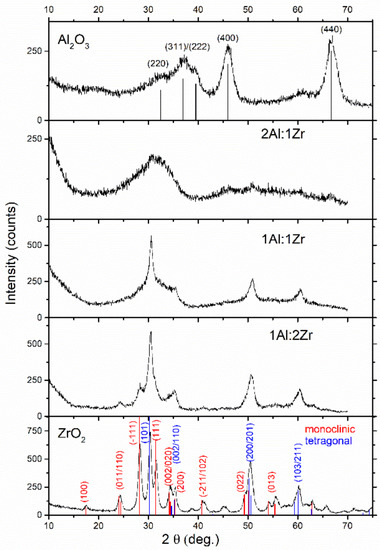 XRD patterns of pure and binary oxides are presented in Figure 1. XRD of the pure alumina sample is characterized by diffractions characteristic for cubic γ-alumina (γ-Al2.144O3.2, PDF No. 79-1558), which has spinel-type lattice that contains cation vacancies. Broad diffraction peaks indicate the nanocrystalline nature of alumina and the possible presence of amorphous material. Pure ZrO2 crystalizes in an initial, metastable tetragonal crystal phase (JCPDS 81-1544) usually formed at temperatures higher than 330 °C (formation of m-tetragonal nuclei), and in monoclinic (JCPDS 65-1025) crystalline structure, the latter being expected in the presented experimental conditions. X-ray diffractions of the composite with the lowest amount of zirconia (2Al:1Zr) indicated that crystallization of alumina is suppressed even for that Al/Zr ratio, although still no presence of crystalline zirconia can be seen, so the sample should be considered as amorphous. XRD patterns of the other two composites are dominated by peaks related to initial, metastable tetragonal zirconia, which can be expected due to the presence of trivalent (Al) cations in the matrix, which improve the stability of the tetragonal phase and induce the formation of oxygen vacancies [28]. In addition, according to literature data [29] the presence of Al2O3 can shift the temperature of m-tetragonal phase crystallization to higher temperatures compared to pure ZrO2, from 400 °C (pure ZrO2) to 750 °C (10% Al2O3). The temperature of formation of the monoclinic crystalline phase is consequently increased with an increase of alumina content: pure ZrO2 calcined at 450 °C had both crystalline phases, and samples containing 10% of Al2O3 do not contain the monoclinic phase up to 750 °C [29]. We observed similar behavior: after the annealing of samples at 500 °C in pure ZrO2, both phases were detectable but in composite samples the m-tetragonal phase was a dominant phase of zirconia, with traces of low-intensity peaks of the monoclinic phase (Figure 1). Similar results were obtained when zirconia was doped with Si4+ ions in Carevic et al. [7]. The addition of silica ions induced reduction of particle sizes of zirconia and a delay of crystallization in stable monoclinic form to temperatures higher than 600 °C.