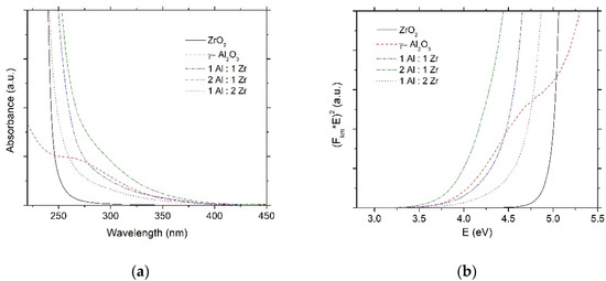 (a) Absorption spectra (obtained using Kubelka–Munk transformation of DRS) and (b) Tauc’s plots of pure alumina and zirconia and of binary oxide composites, in order to estimate band gap energies of photocatalysts.