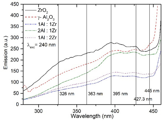 All samples gave similar PL spectra, characterized by broad, overlapped bands with weak peaks/shoulders at about 325 nm, 363 nm, 395 nm, 425 nm and 445 nm. Pure oxides also resembled each other. It should be borne in mind that alumina was mostly amorphous with a dominant influence of defects and decreased optical band gap energy of 3.9 eV, compared to a bulk value of 9 eV [32]. All observed shoulders in the spectra of pure alumina can be assigned to defects/color centers in the band gap of alumina: 395 nm to Fs and Fs+ (Fs is surface perturbed neutral oxygen vacancy) and shoulders above 400 nm (420–450 nm) to F emission centers. In the case of pure zirconia, the broad nature of spectral features also strongly indicated that fluorescence involves defect/intraband/extrinsic states. Excitation energy exceeds the band gap energy of ZrO2 nanoparticles, and photogenerated electrons can be trapped by oxygen vacancies (VO) and create neutral or charged F centers [31]. Recombination of valence band holes and F centers gives rise to broad band emission between 320–450 nm. Mixed oxides have the shapes of PL spectra similar to pure oxides, with lower intensities. This shape can propose the same recombination mechanisms as in the pure oxides (defects) [32], where lower intensities can indicate the decrease of recombination of photogenerated charges. These can be induced by newly formed defects at the interface between alumina and zirconia, which can trap electrons [33].