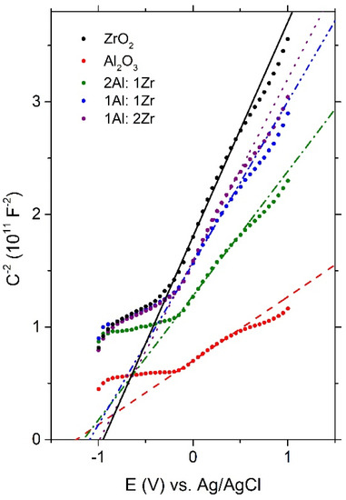 The Mott–Schottky plot gave a straight line for the C−2 vs. E plot with interception with a potential axis at Efb. The positive slope of the plots indicated that all investigated samples were n-type semiconductors. The obtained values of flat band potential are given with respect to SHE, and are listed in Table 2.