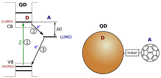 Quantum dots (QDs) have a number of advantages, which makes them attractive in the design of the photo-activated DA systems [14]. To mention just a few, there is the broad absorption at wavelengths shorter than that corresponding to the band gap and the possibility of tuning the low edge of the conduction band (CB) by tuning the size of QDs. The formation of DA–molecule hybrids can be also achieved relatively easily by using the self-assembling approach. The molecule can be equipped with a suitable binding group (e.g., carboxyl in the case of CdSe QD), and stable hybrids are formed spontaneously in a mixed solution in a statistical manner. At the same time, QDs have discrete energy states (due to quantum confinement, see Figure 2), and their electronic interactions can be treated similarly to that between molecules. For the comparison purpose, the DAs of interest here are QD-C60 hybrids.
