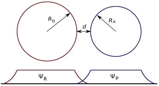 In the most crude approximation, both the donor and acceptor are spheres, as schematically presented in Figure 3. To start with, we will ignore all the specificity of the wave functions inside the spheres and set it to a constant value inside the sphere and zero outside, or