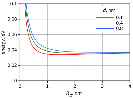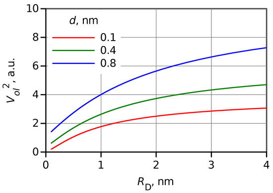Dependence of the square of overlap volume, , on the donor radius estimated for three values of DA distances, d indicated in the plot.