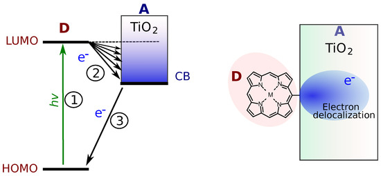 There are numerous example of molecules attached to semiconductor surfaces which show extremely fast picosecond and subpicosecond PET across the interface. Probably, the most studied example is the dye-sensitized solar cells in which case sensitizing molecules are electron donors deposited on a semiconductor electrode, typically TiO2 [44]. It can be noted that the low edge energy of the CB of TiO2 is close to the LUMO of C60, and energetically, the case is similar to the porphyrin–fullerene molecular dyad [45]. However, the reported ET time constant for the interfacial ET is as fast as in molecular dyads or even faster [44,46,47], despite the fact that size of the electron acceptor, the TiO2 electrode, is much larger than that of the molecular C60 acceptor. There are at least two reasons for this, as schematically presented in Figure 7. Firstly, right after the electron injection to a semiconductor, the electronic wave function is delocalized over a limited area (right plot in Figure 7), although the degree of delocalization is a subject of study, and it changes in time as the electron moves to the bulk [48]. Secondly, there are multiple energy states in the semiconductor, each of which can accept the electron, which are presented by the multiple possible reactions (2) in Figure 7, arrows from LUMO of the D to the CB of TiO2. This is usually discussed in terms of the density of states, and this is probably the main reason for much faster electron transfer.