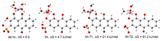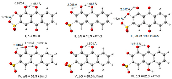 1,2-dihydroxyanthraquinone-3-sulfonate (ARS) is a polycyclic aromatic compound composed of three fused six-member rings, with two carbonyl groups in the central ring at the C-9 and C-10 positions. Additionally, one of outer rings bears two hydroxyl groups at the C-1 and C-2 positions and a sulfonate group at position C-3 (Scheme 1). Taking into account the pKa values reported for the two phenolic protons (pKa2 = 5.8 and pKa3 = 10.8) [44] and that the sulfonate group ionizes at very low pH, the monoanionic form of ARS (Scheme 1) is the dominant form in the pH region explored in this work (pH~4). Its structure, in addition to presenting several conformers formed by rotation of the CC-OH coordinates, may also present tautomerism involving the transfer of hydrogen atoms between the carbonyl and hydroxyl groups (keto–enol tautomerism). The structures and relative zero-point-corrected electronic energies of the different forms of ARS in water were previously studied by Joó et al. using DFT calculations (6-311+G(d,p) and TZVP basis sets and several different functionals) [45]. In our work, we have carried out additional studies on the structures and energetics of these species to determine their relative Gibbs energies (which include thermal corrections) which enable us to calculate their populations in water solutions at room temperature. These are essential for our theoretical studies of the spectroscopic properties of the ligand and Ga(III) complexes of ARS. Additionally, analysis of the structural details of the intramolecular hydrogen bonding in the most stable forms was also carried out.