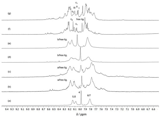 1H NMR spectra of the solutions (50% D2O/50% CD3OD) of (a) ARS 5 mmol dm−3, pH* = 3.96, temp. 298.15 K; (b) Ga/ARS 5:5 mmol dm−3, pH* = 3.95, temp. 280.15 K; (c) Ga/ARS 5:5 mmol dm−3, pH* = 3.95, temp. 298.15 K; (d) Ga/ARS 2.5:5 mmol dm−3, pH* = 4.06, temp. 280.15 K; (e) Ga/ARS 2.5:5 mmol dm−3, pH* = 4.06, temp. 298.15 K; (f) Ga/ARS 1.67:5.0 mmol dm−3, pH* = 3.94, temp. 280.15 K; (g) Ga/ARS 1.67:5.0 mmol dm−3, pH* = 3.94, temp. 298.15 K.