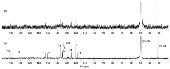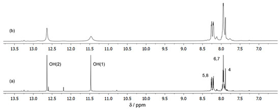 We have also obtained 13C spectra for the same solutions and the spectrum of the 1:1 solution is shown for illustration in Figure 3. It was not possible to achieve for this solution (1:1) a signal/noise ratio adequate to easily detect all the signals and increased difficulties were also found for the 1:2 and 1:3 solutions, due to the low abundance of the 13C isotope, the low concentration of the complexed species and the associated exchange processes between them. The 13C NMR spectrum of the solution of Ga(III)/ARS 5.0:5.0 mmol dm−3 (1:1) (Figure 3b) showed that, relative to the free ligand (Figure 3a), intensity changes in the signals corresponding to the 13C nuclei of C-1, C-9, and C-13, suggesting the presence of one or more complexes in which the ligand was coordinated to the metal through the OH-1 and C(9)=O groups, with the intensity of C-13 also being affected as it is adjacent to both the C-1 and the C-9 atoms. Further support comes from the 1H spectra of Ga3+/ARS 5:5 mmol dm−3 solutions at temp. 298.15 K in DMSO, as shown in Figure 4, taking into account the intense broadening of the OH-1 signal in comparison with the slight broadening of OH-2, in the presence of the metal, suggesting that the coordination of the ligand through the OH-2 group will be unlikely at low pH, in accordance with the pKa values of the two phenolic protons (pKa2 = 5.8 and pKa3 = 10.8) [44].