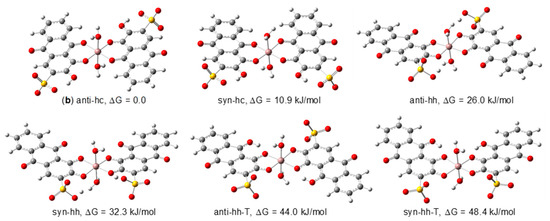 [Ga(ARS)2(H2O)2]− isomeric structures considered to determine the structure of the 1:2 Ga(III)/ARS complex (optimized at the B3LYP/6-311G(d,p) in water).
