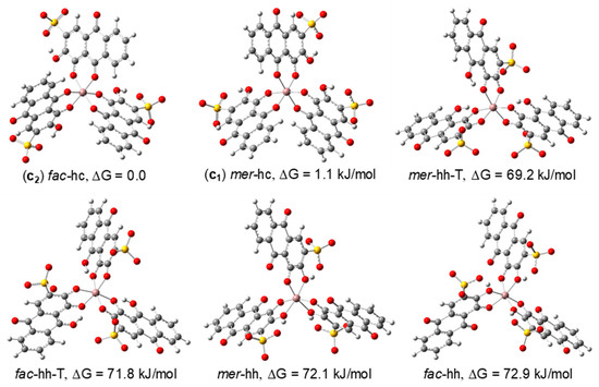 [Ga(ARS)3]3− isomeric structures considered to determine the structure of the 1:3 Ga(III)/ARS complexes (optimized at the B3LYP/6-311G(d,p) in water).
