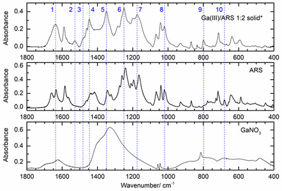 ATR-FTIR spectra (1800–400 cm–1) of solid Ga(NO3)3 (bottom), solid ARS (middle), and the solid sample obtained from a 2.5:5 mmol dm−3 Ga(III):ARS solution at pH = 4 (top); (*solid obtained after evaporation of the solvents from the Ga(III):ARS sample).