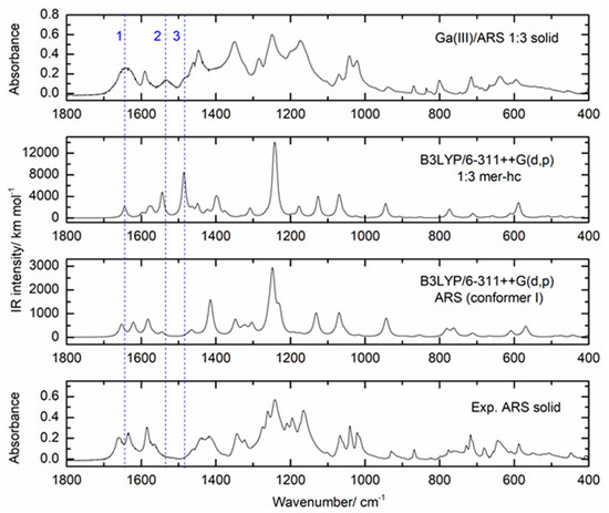 ATR-FTIR spectra (1800–400 cm–1) of the solid powder samples of ARS and of the 1:3 Ga(III)/ARS sample (bottom and top spectra, respectively), compared with the B3LYP/6-311++G(d,p) calculated spectra for conformer I of ARS (middle bottom) and for the 1:3 mer structure (middle top). The calculated spectra were simulated using Lorentzian functions with a full-width-at-half-maximum (FWHM) of 6 cm−1, centred at the scaled calculated frequencies.