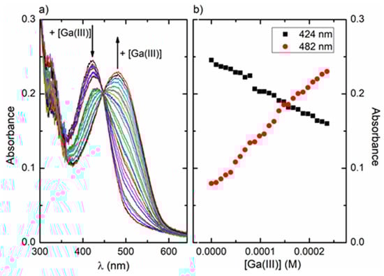 (a) Absorption spectra of ARS (4.67 × 10−5 mol/dm3) in H2O:CH3OH 1:1 (v/v) in the presence of increasing concentrations of Ga(III) (0–2.36 × 10−4 mol/dm3; steps of 9.84 × 10−6 mol/dm3) at pH 4; (b) absorbance intensity at 424 nm (black squares) and 482 nm (red circles) as a function of Ga(III) concentration at pH 4.
