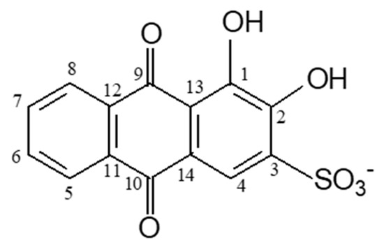 Anthraquinones and their derivatives are organic compounds that are highly relevant due to their enormous versatility in many diverse applications, such as in industry as dyes [8,9,10], in medicine as pharmaceutical drugs [11,12], and in chemistry as analytical reagents [13,14]. Hydroxyanthraquinones are particularly important for applications based on chromatic properties, since their lowest excited singlet state, with π,π* character, enables them to absorb visible light and have bright colours, contrary to anthraquinone which has a n,π* lowest excited singlet state [15,16]. The optical properties of the substituted anthraquinones depend on factors such as the nature and position of the substituents and the establishment of hydrogen bonds and other intermolecular interactions [15]. Alizarin, (1,2-di-hydroxyanthraquinone, 1,2-HAQ) is one of the most stable natural pigments and the main colouring component (together with purpurin, 1,2,4-HAQ) of the natural pigment madder, extracted from Rubia tinctorum L., and is widely used to dye textiles. Nowadays, alizarin is usually obtained from synthesis. Alizarin has also been investigated as a photosensitizer in dye-sensitized solar cells, showing high incident photon-to-current conversion efficiencies [17,18,19]. By introducing a sulfonate group into the alizarin structure, a derivative with greater water solubility is obtained (1,2-dihydroxyanthraquinone-3-sulfonate, or alizarin red S (ARS)), whose photophysics and photochemistry has been extensively studied due to its chromatic and fluorescence properties. ARS also shows interesting electrochemical behaviour and its performance as a negolyte in redox flow batteries has been investigated recently [20]. Its complexation behaviour with various metal ions has also been the subject of intense investigation, since its phenolic and carbonyl groups (Scheme 1) offer the possibility for metal–ligand complexation.