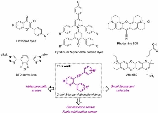 In general, the incorporation of a nitrogen atom in polycyclic aromatic structures can induce or improve their electromagnetic, physicochemical, optical, and structural properties [30,31,32]. Through chemical modification/doping of the π-conjugated system with nitrogen, it is possible to control the main characteristics of the electronic structure, including the band gap, optical absorption spectra, photoluminescence, and redox behavior. As these parameters can be easily adjusted, many heteroaromatic compounds have been applied as NIR-active dyes [33], two-photon absorbers [34], and fluorescence sensors [35]. In addition, nitrogen doping is employed as a means of band-gap adjustment in π-conjugated polymers [36] and graphene nanoribbons [37], and to obtain small-molecule semiconductors [38]. Finally, the literature also reports some interesting studies using push–pull systems based on pyridine groups in dye-sensitized solar cells [39], hole-transport material in perovskite solar cells [40,41,42], and as an optical sensor that can be used as a fluorescent probe for the detection of nitroaromatic explosives [43,44]. Recently, the electronic behavior of small molecules has also been studied in ITIC, a new generation of non-fullerene electron-accepting small molecules for organic photovoltaics (OPVs), due to nitrogen substitution/insertion in different positions of the molecule [45]. In addition, small nitrogen compounds from 2-N-aminoquinazolines were also evaluated as fluorophores in solution and solid state [46]. Our research group has focused attention on the influence of chalcogens on the reactivity and properties of organochalcogen compounds [47,48,49]. Finally, we demonstrate here the photophysical characterization of 2-aryl-3-(organylethynyl)pyridine derivatives (Figure 1), recently described by us as substrates in visible-light-promoted selenocyclization reactions for the formation of Se-functionalized benzo[h]quinolines [50]. In addition, to broaden the scope of application of these compounds, based on their electronic features, they were successfully employed as optical sensors for the detection of fuel adulteration in commercial standard and premium gasoline. It should be noted that the application of small molecules is often not explored in depth, leaving a barrier of knowledge behind molecules of “greater complexity”.