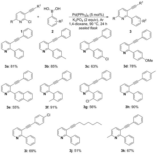 The 2-aryl-3-(organylethynyl)pyridines 3a–k were prepared according to a published procedure, with minor changes [56]. In a dried sealed Schlenk tube under argon atmosphere, the appropriate 2-chloro-3-(organylethynyl)pyridine 1 (2.0 mmol), aryl boronic acid 2 (2.0 equiv, 4.0 mmol), Pd(PPh3)4 (5 mol%, 0.115 g), K3PO4 (2.0 equiv, 2.0 mmol), and 1,4-dioxane (8.0 mL) were added (Scheme 2). The mixture remained under magnetic stirring for 24 h at 90 °C (oil bath). After that, the reaction was extracted with ethyl acetate, and the organic phase was washed with a saturated aqueous NaCl solution. The organic phase was separated, dried over MgSO4, filtered, and the solvent evaporated under reduced pressure. The crude material was further purified by column chromatography (hexanes/ethyl acetate) on silica gel. The yield was 51–91%.