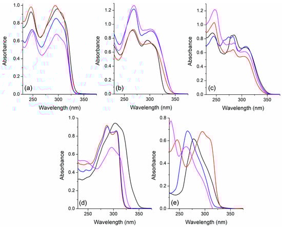 UV-Vis absorption spectra of the pyridine-based fluorophores (a) 3a, (b) 3d, (c) 3e, (d) 3f, and (e) 3j in solution [~10−5 M] in benzene (black), ethanol (red), hexane (blue), and dichloromethane (magenta).